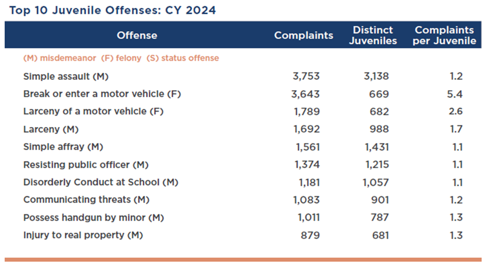 8. Top 10 juvenile offenses (page 13): Minor offenses continue to dominate this list, while possession of a handgun by a minor is on the rise.